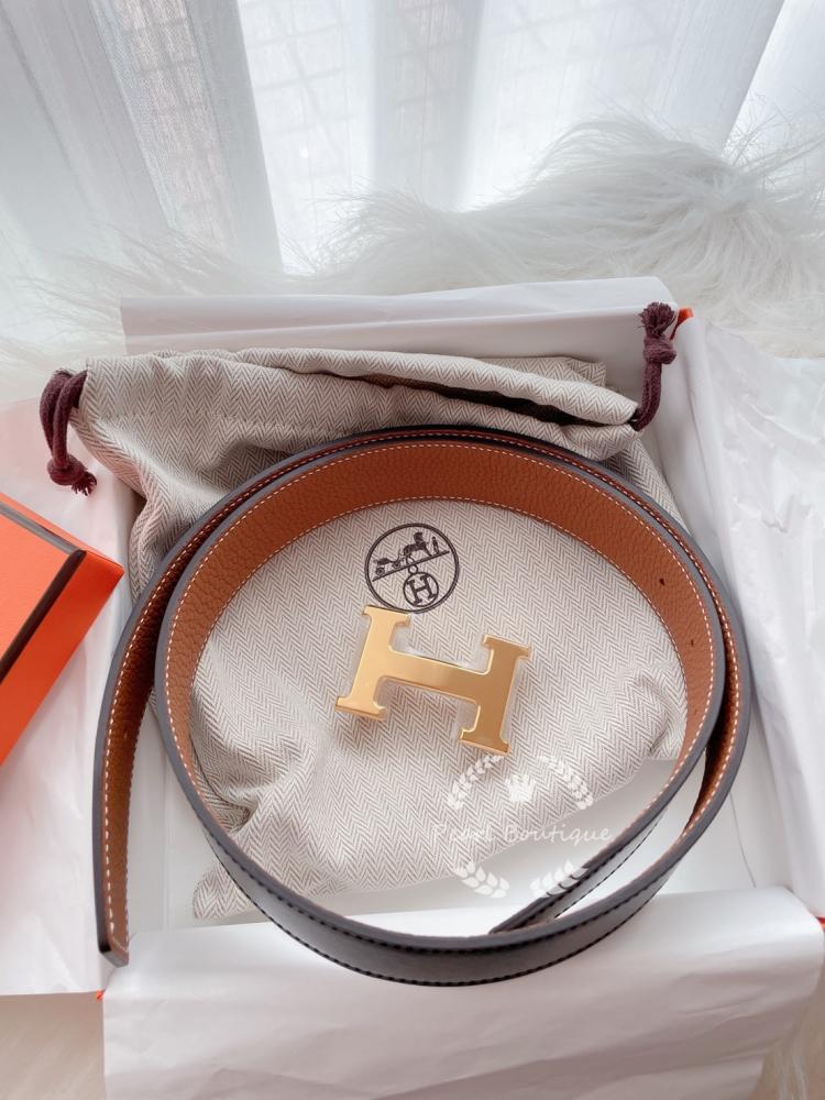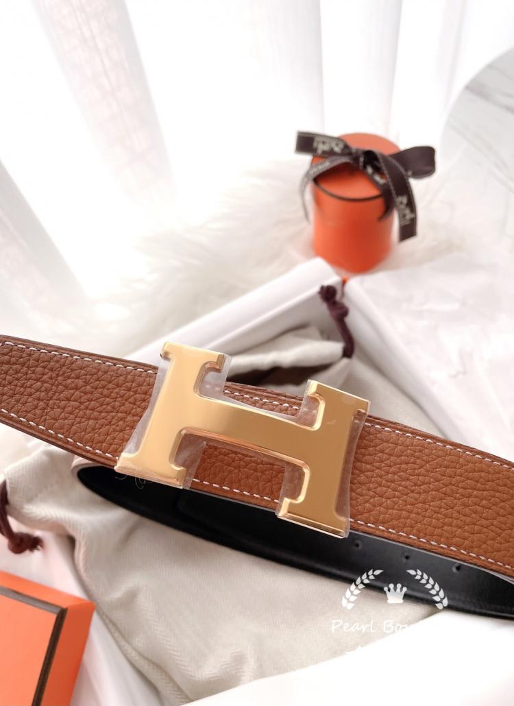 Hermes經典H皮帶金棕色x金扣