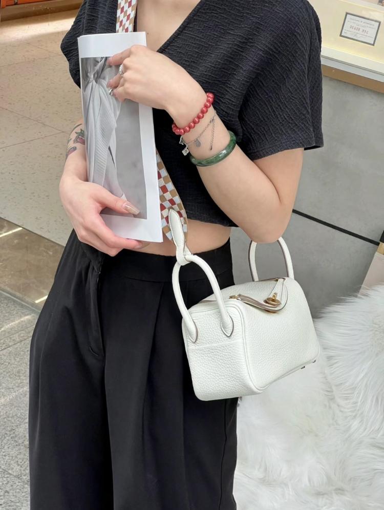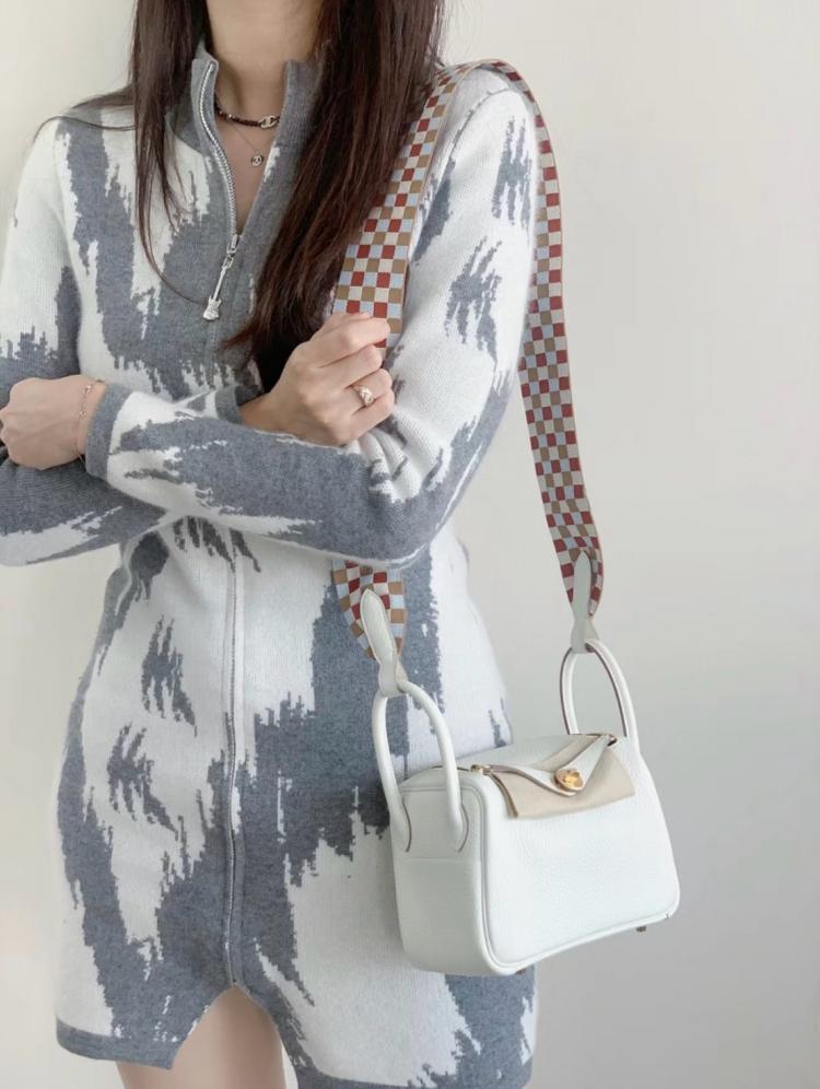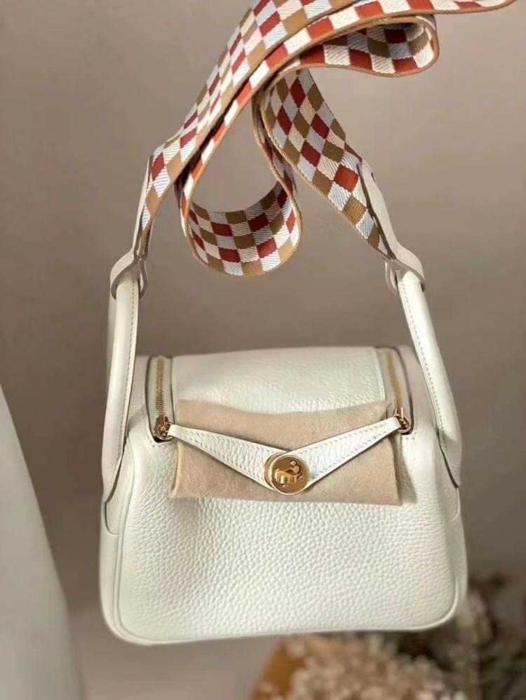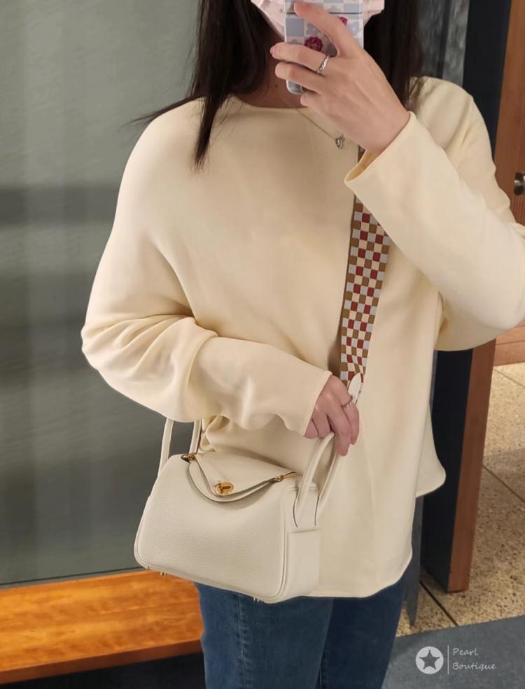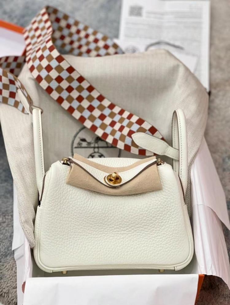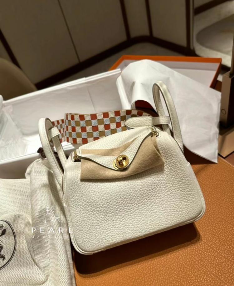 Hermes 《歐洲現貨》Mini Lindy OS蘑菇白x金釦x特殊編織格子背帶